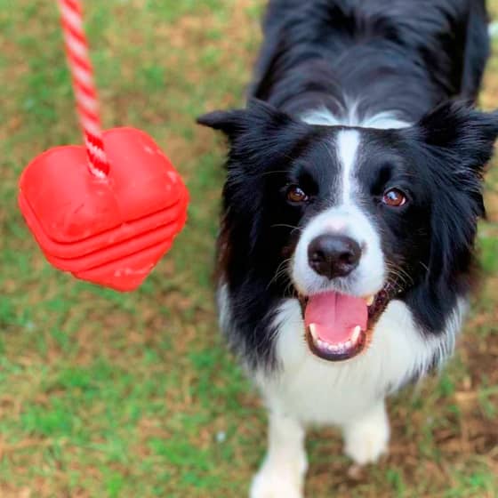Love this training heart. Rope fits tight in the heart so you can play tug of war too and not worry about the rope either breaking of popping out of the toy. Bright color. List one at the dog park. I've got a German Shepherd Dog and he cant even destroy it.