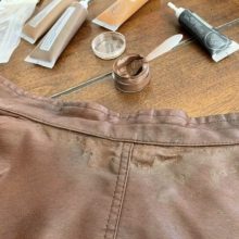 It looks better than before. I tried and tried to match the color but knew what I was missing was red for my faux leather jacket that was peeling just under the collar. Finally, I decided to try adding red acrylic paint and it didn’t take long before I had almost exactly the color I needed. I will add a couple more layers and hope it doesn’t look too much like a repair. I couldn’t wear it the way it was so I figured I couldn’t ruin it any worse.