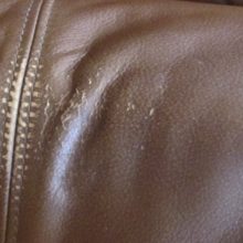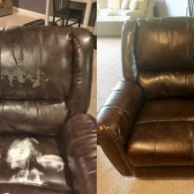 I should have taken a before photo so I could show the difference but I didn’t. We had one big tear in our “pleather” sofa as well as many scratches and small holes. Most were made by our cat walking on the couch and her nails just made little pin holes. The tear was about the size of a quarter and was caused by a bug spray coming in contact with the couch and delaminating it. I have to say, this product does a better job fixing large holes/tears than small. Our couch is chocolate so I used the black. I also did’t need the patch material. Applied one coat, gave about an hour to dry then reapplied. You can’t see the big hole unless you look for it. so much better than before.